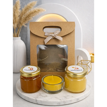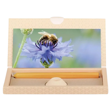 Versandfertiges Set bestehend aus Kerze, Kerzenständer, Karte und Schachtel – mit Kerze aus 80% Bienenwachs – Karte mit Infotext zum Bienenwachs auf Rückseite.
